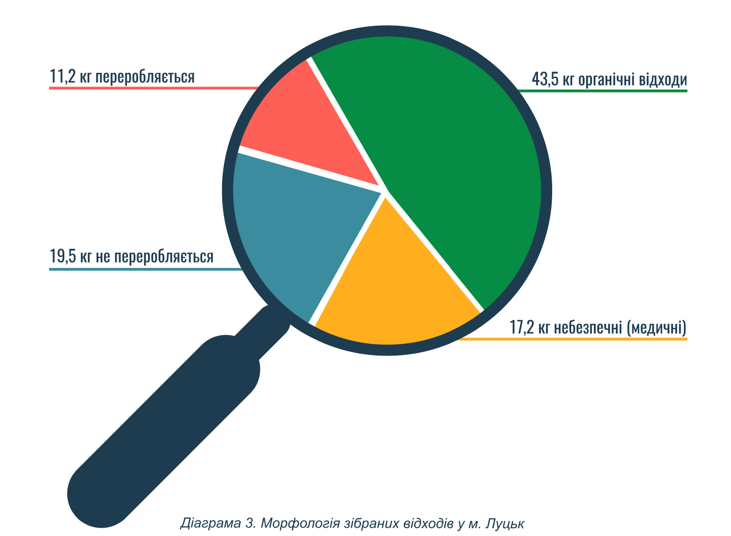 - 11,2 кг відходів, що можна переробити (1,3 кг ПЕТ-пляшки, 2 кг паперу, 5 кг скла, 0,7 кг металу, 2,2 кг інших видів пластику)