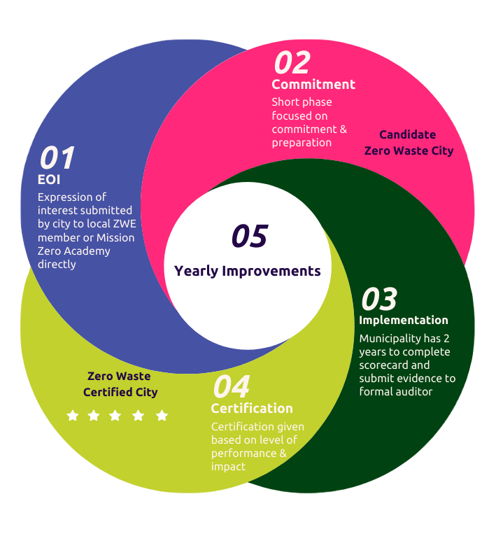 Цей процес складається з кількох етапів: місто спочатку зобов’язується скорочувати відходи, розробляє програму їх управління, впроваджує рішення, проходить аудит та регулярно вдосконалює свої підходи.